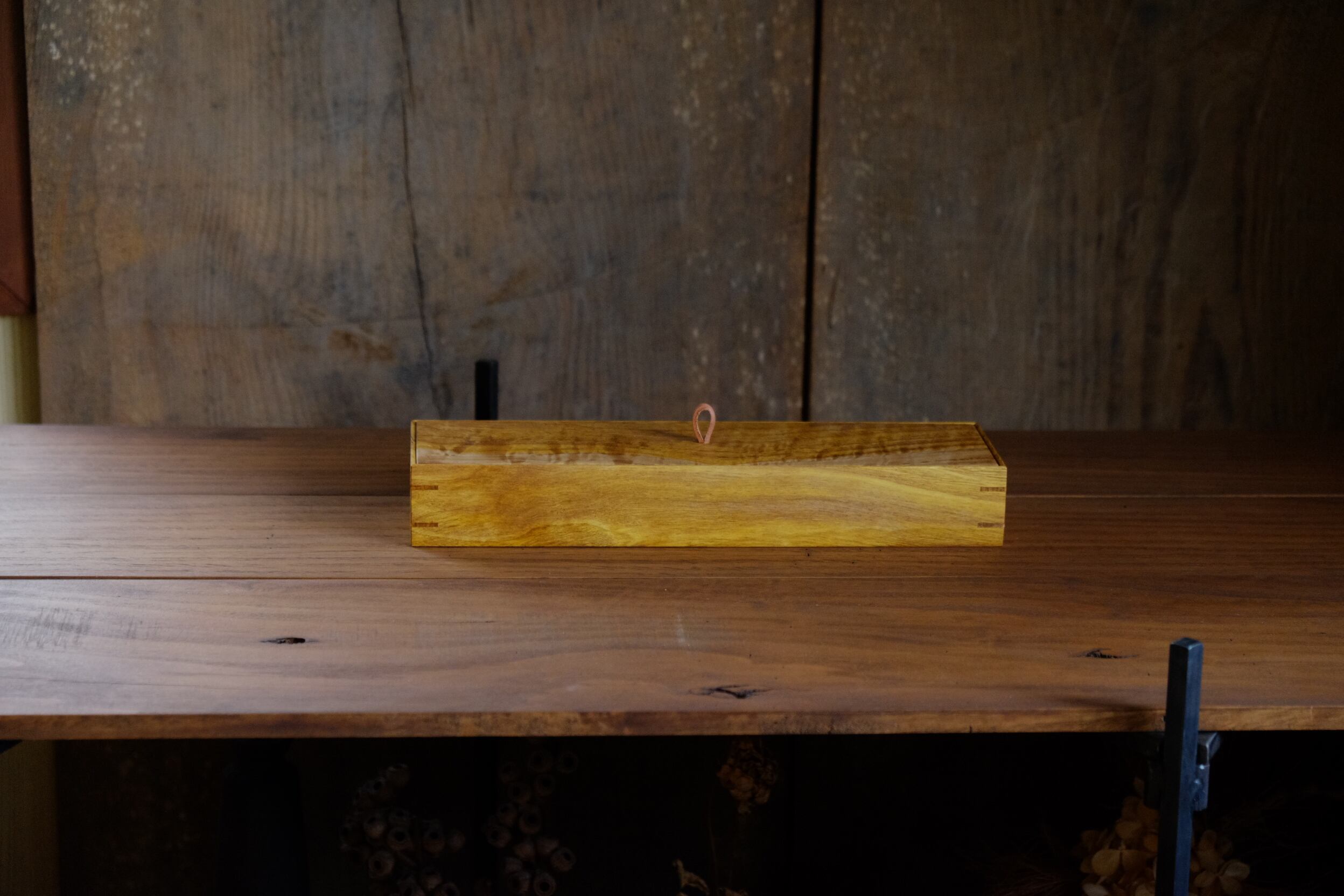 山口県内で伐採された椎の木を用い、終始丁寧な作業を心がけながら制作した小箱です。黄色い色も素材自身の色で、この材色と波打つような入り組んだフタの木目がとても美しい1品となりました。